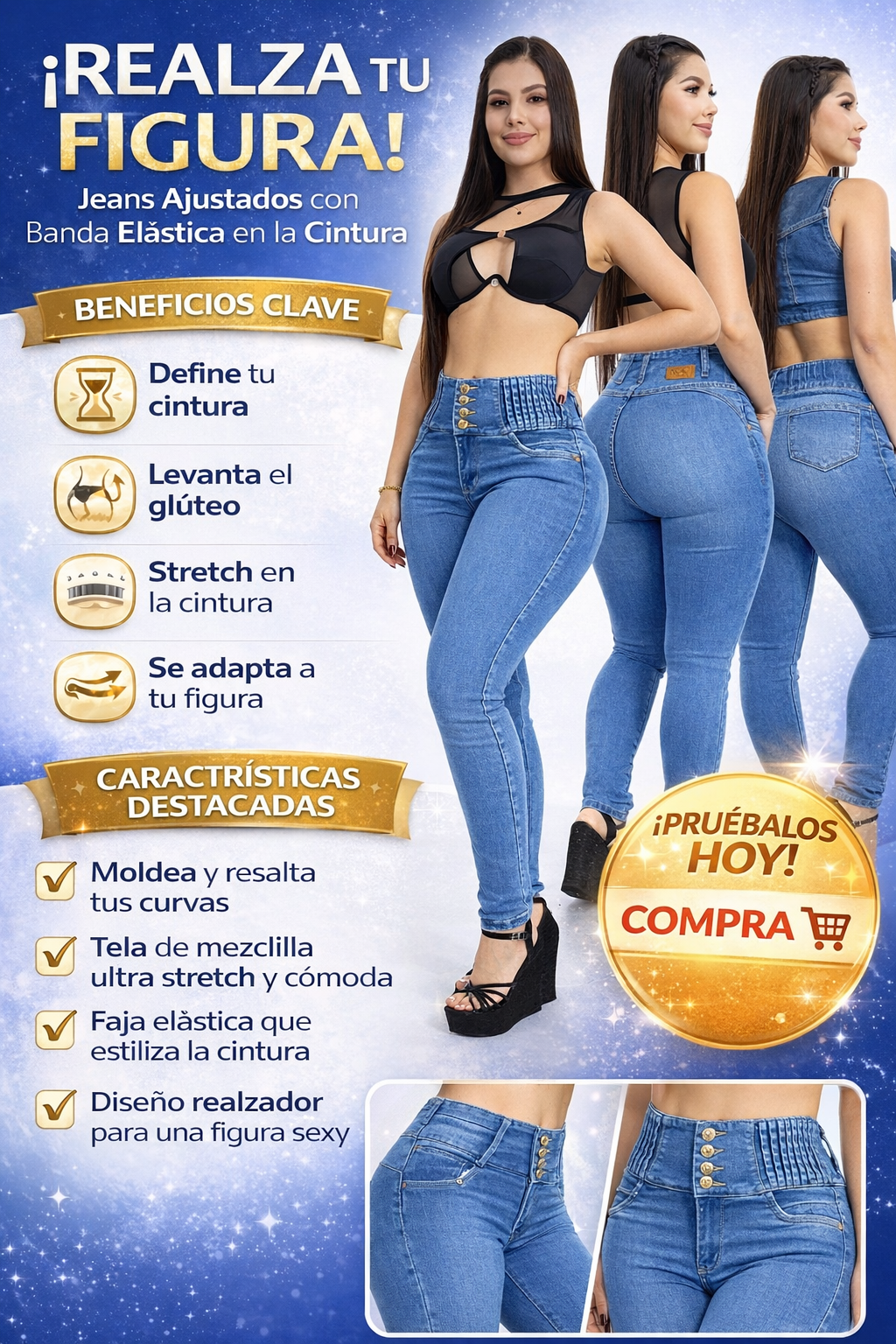 Material: Mezcla de denim elástico premium.